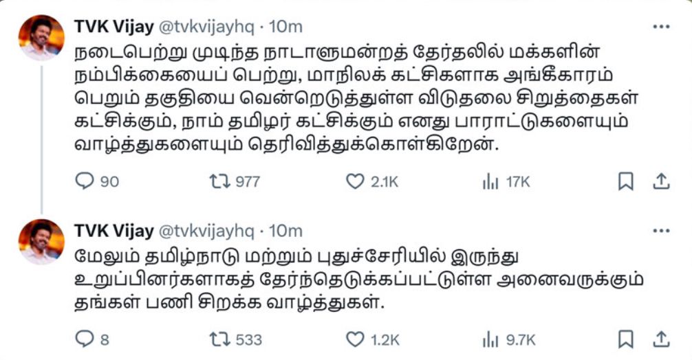 He congratulated the Viduthalai Chiruthaigal Katchi party and the Naam Tamilar Party for their recognition as state parties in Tamil Nadu.